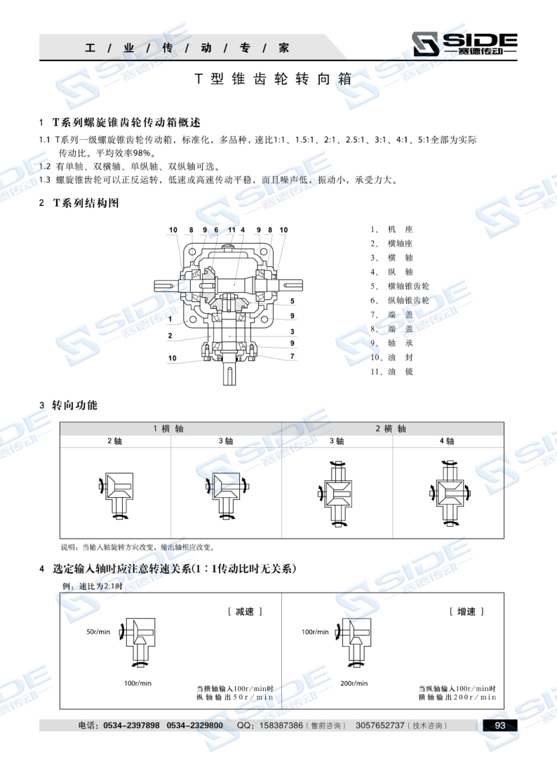 1、T系列螺旋傘齒輪轉(zhuǎn)向箱,標(biāo)準(zhǔn)化,多品種, 速比全部為實(shí)際傳動(dòng)比。平均效率達(dá)98% 。